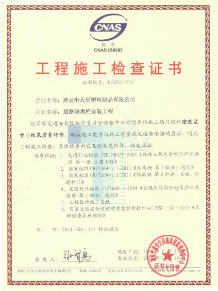 交通工程产品工程安装施工合格证书
