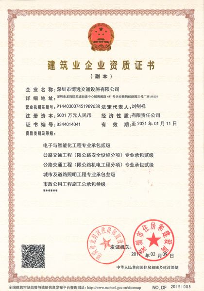 深圳市博远交通设施有限公司创建于2003年,注册资本5001万元,总部位于深圳,设有南宁、广州、成都分公司,是一家专业从事智能交通产品研发、生产、销售、施工、安装及服务的高新技术企业。公司在深圳、南宁自建有办公写字楼、生产厂房、员工宿舍园区等,配套设施齐全。公司重视企业内部管理与发展,严格实施ISO管理体系,率先通过了ISO9001-2008质量管理体系认证、ISO14001:2004环境管理体系及OHSAS18001:2007职业健康安全管理体系的认证,并通过了国家高新技术企业认证,为公司的长远发展奠定了稳健基础。 经过十多年的积累与沉淀,博远在智能交通行业已形成雄厚的专业实力,拥有众多从事本专业20多年的技术骨干与数十名中、高级工程师,以及一批经验丰富、高素质的管理英才。近年来,公司广泛与清华、北大等高校开展“产学研”合作和技术交流,进行面向...... [ 查看详情 ]